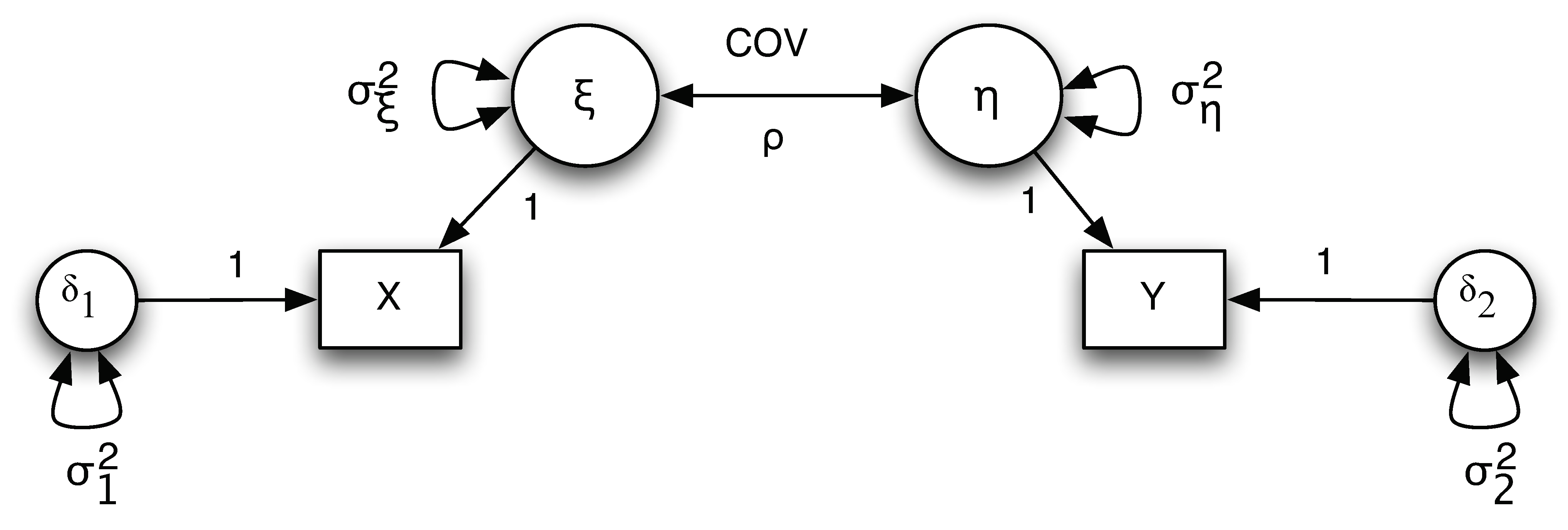 The variances for the true score $\xi$ and $\eta$ are $\sigma_{\xi}^2$ and $\sigma_{\eta}^2$, respectively. The variances for the measurement error $\delta_1$ and $\delta_2$ are $\sigma_{1}^2$ and $\sigma_{2}^2$, respectively. The covariance between $\xi$ and $\eta$ is $\sigma_{\xi \eta}$