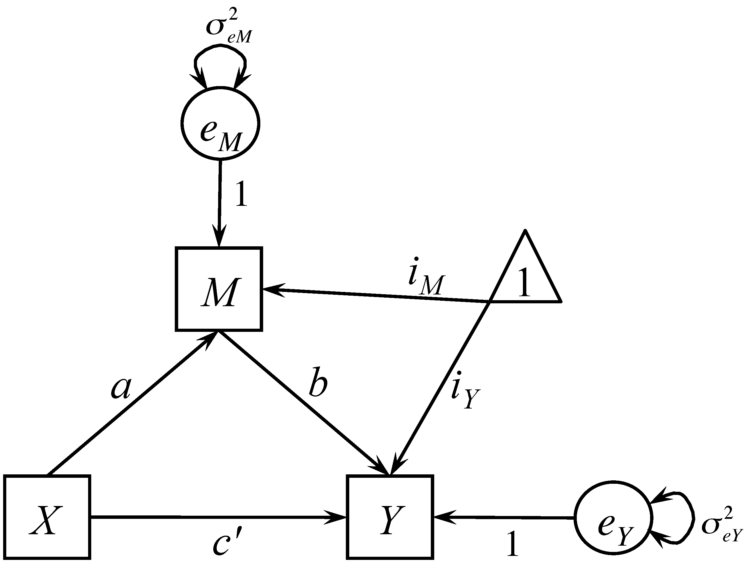 \begin{eqnarray*} M & = & i_{M}+aX+e_{M} \\ Y & = & i_{Y}+c'X+bM+e_{Y}. \end{eqnarray*}