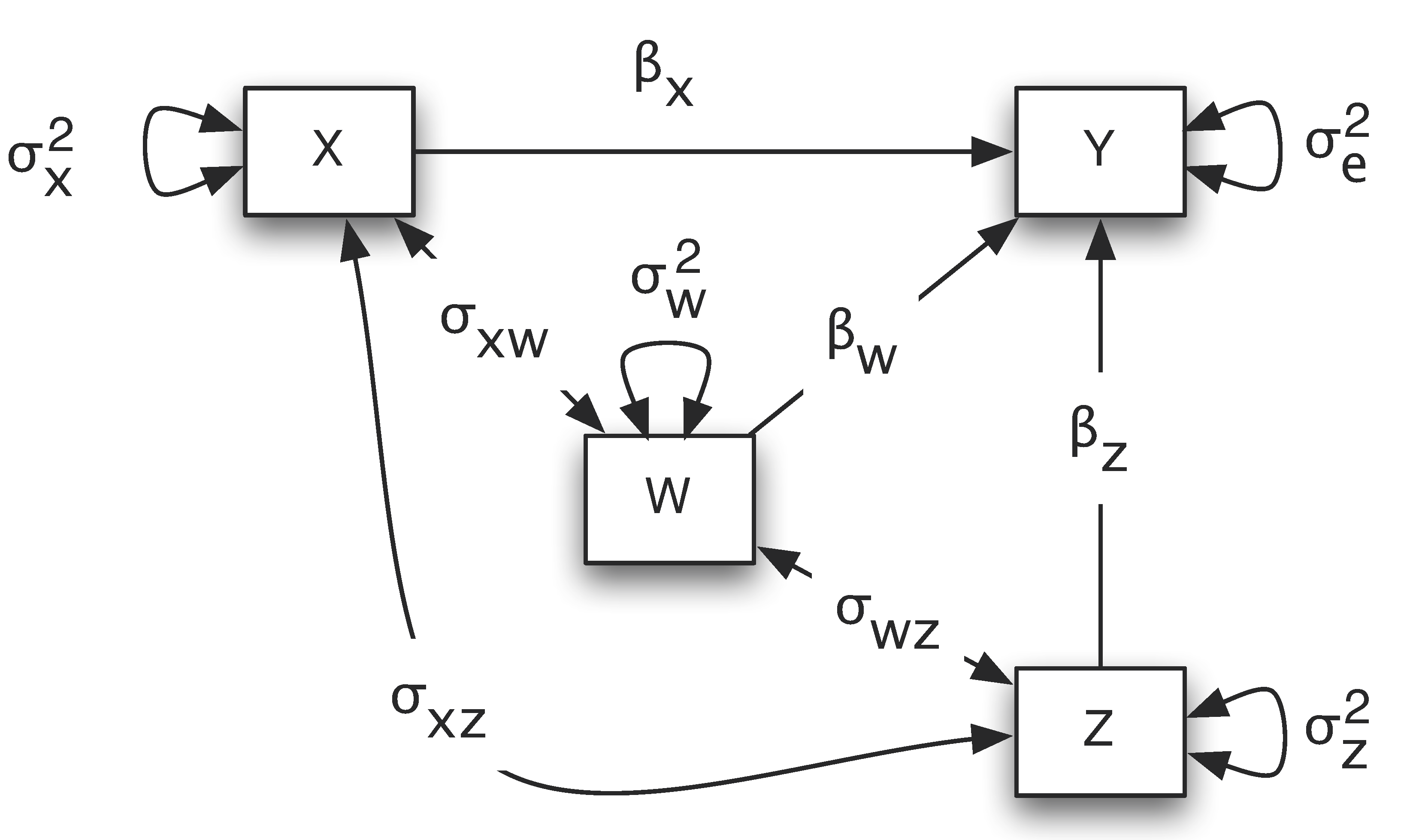 Path analysis is often conducted based on path diagrams. Path diagram represents a model using shapes and paths. For example, the diagram below portrays the multiple regression model $Y=\beta_0 + \beta_X X + \beta_W W + \beta_Z Z + e$.