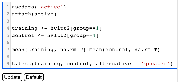 A reader can directly change the R output by clicking the "Update" button. Both input and output are saved for the specific reader, which is different from others. If a reader wants to restore to the default input and output, he/she can click the button "Default".