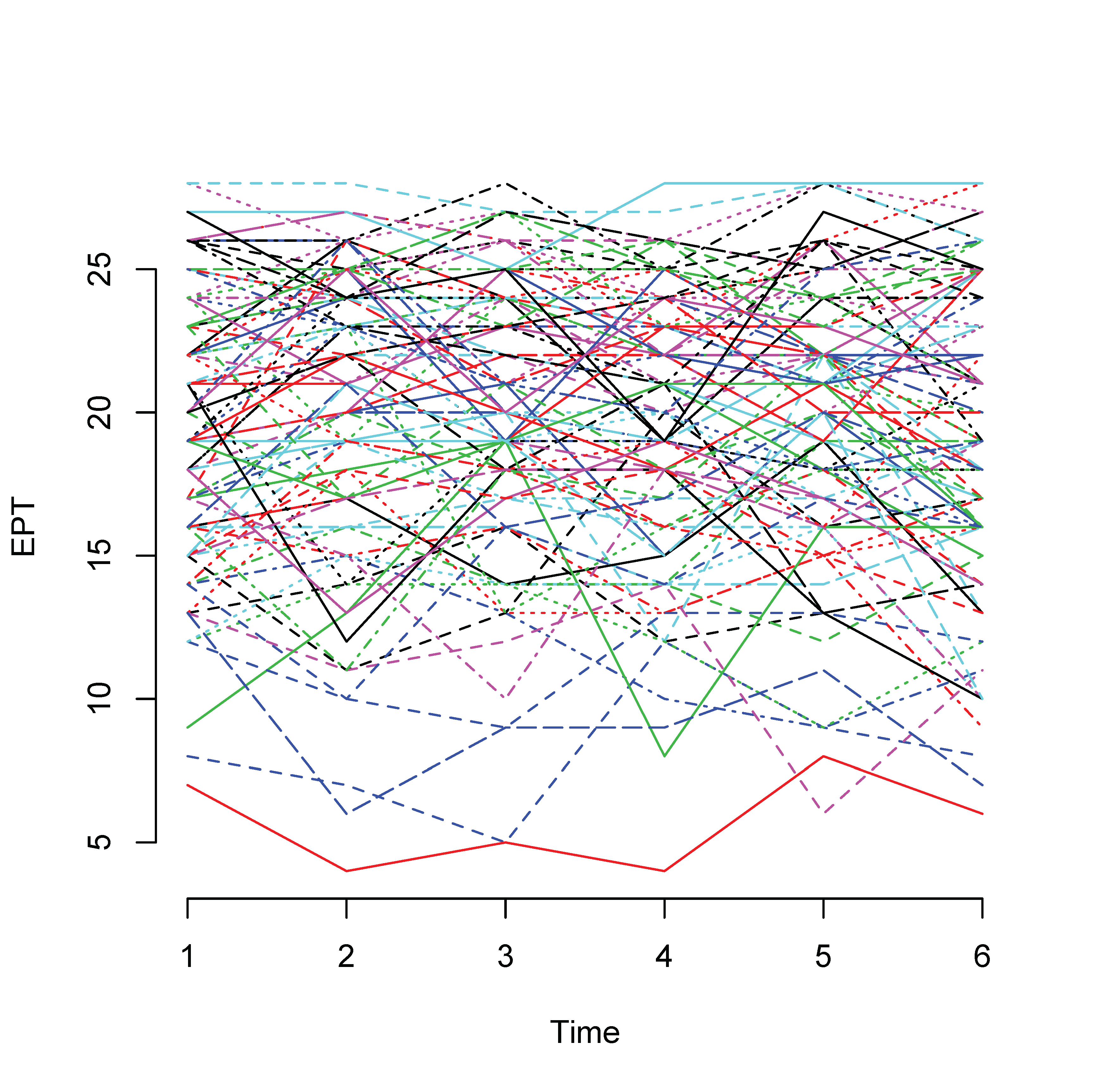 Longitudinal data can be viewed as a special case of the multilevel data where time is nested within individual participants. All longitudinal data share at least three features: (1) the same entities are repeatedly observed over time; (2) the same measurements (including parallel tests) are used; and (3) the timing for each measurement is known (Baltes & Nesselroade, 1979). To study phenomena in their time-related patterns of constancy and change is a primary reason for collecting longitudinal data. Figure 1 show the plot of 50 participants from the ACTIVE study on the variable EPT for 6 times. Clearly, each line represents a participant. From it, we can see how an individual changes over time.