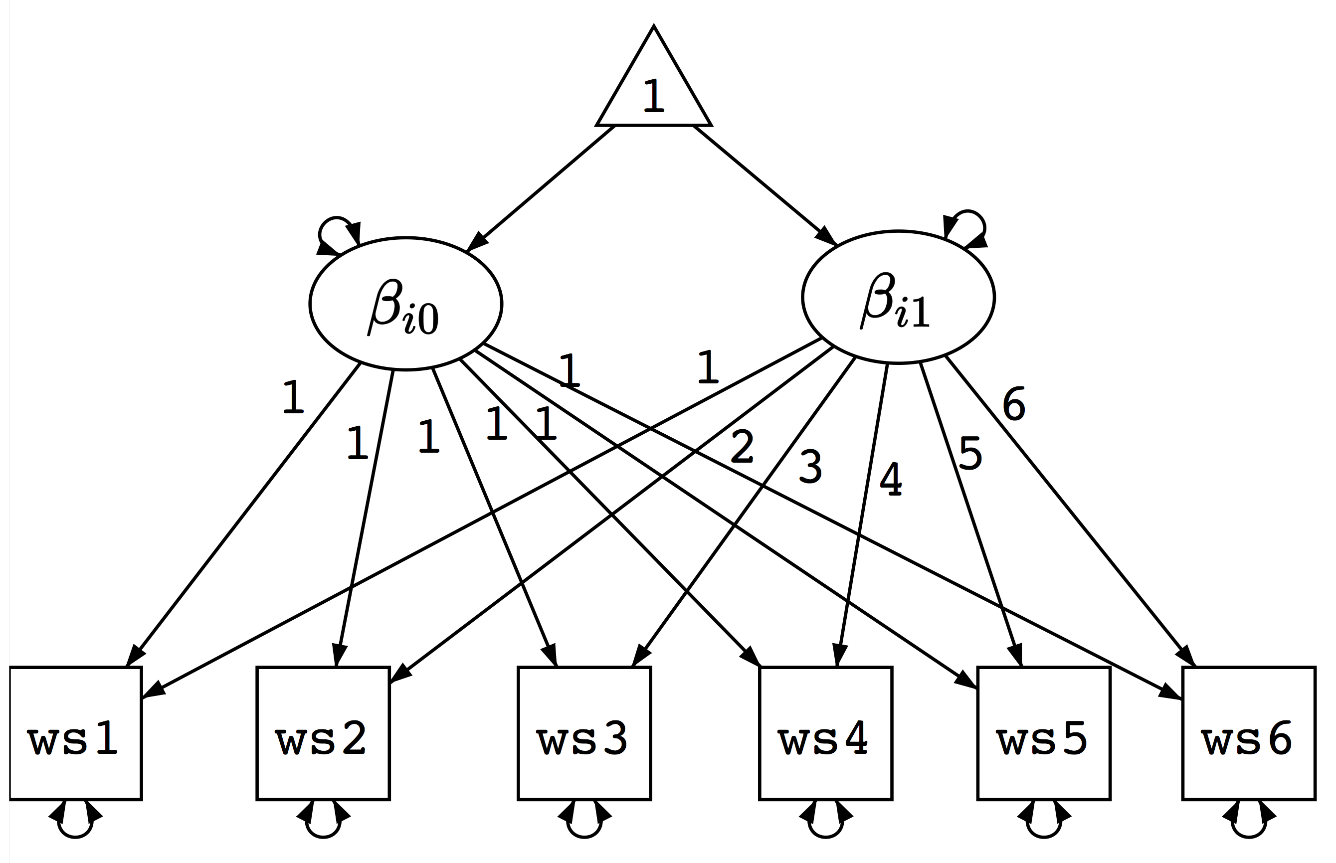 In addition to estimating a GCM as a multilevel or mixed-effects model, we can also estimate it as a SEM. To illustrate this, we consider a linear growth curve model. If a group of participants all have linear change trend, for each individual, we can fit a regression model such as \[ y_{it}=\beta_{i0}+\beta_{i1}t+e_{it} \] where $\beta_{i0}$ and $\beta_{i1}$ are intercept and slope, respectively. Note that here we let $time_{it} = t$. If each individual has different time of data collection, it can still be done in the SEM framework but would be more complex. By writing the time out, we would have