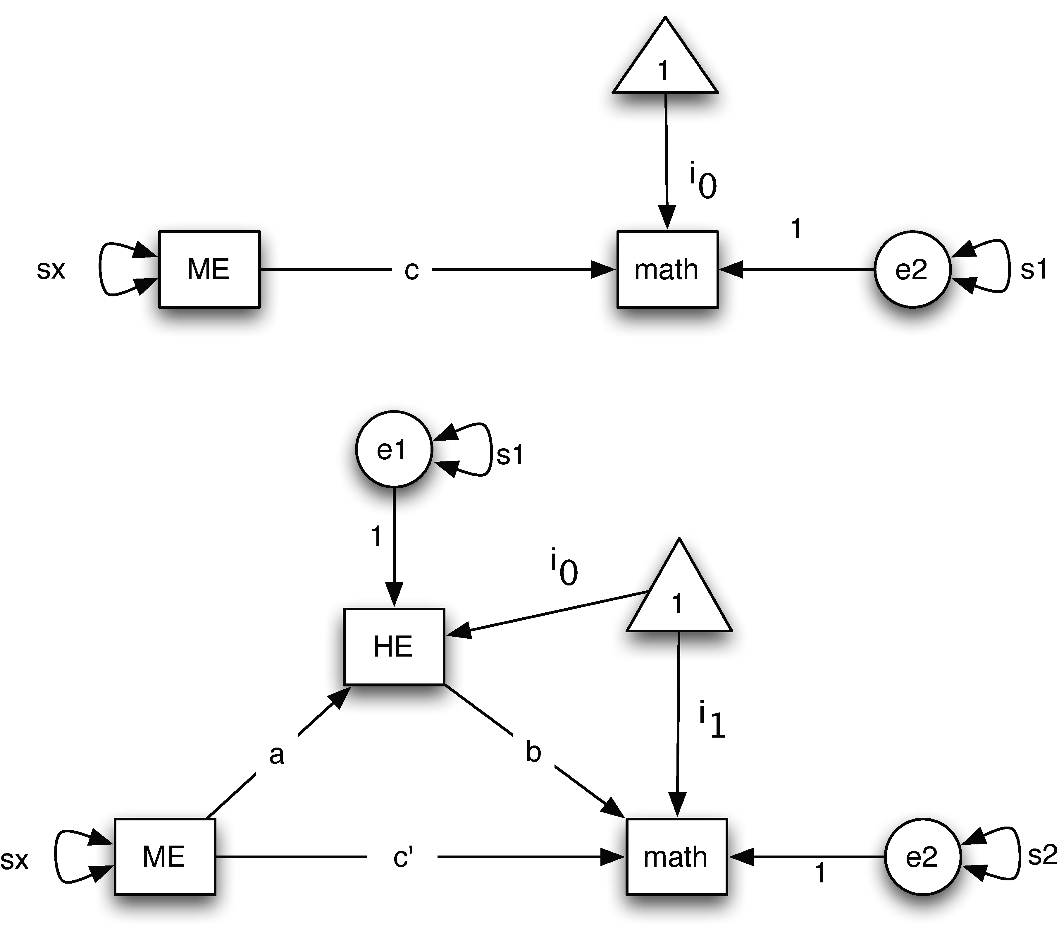 Research has found that parents' education levels can influence adolescent mathematics achievement directly and indirectly. For example, Davis-Kean (2005) showed that parents' education levels are related to children's academic achievement through parents' beliefs and behaviors. To test a similar hypothesis, we investigate whether home environment is a mediator in the relation between mothers' education and children's mathematical achievement. Data used in this example are from the National Longitudinal Survey of Youth, the 1979 cohort (NLSY79, for Human Resource Research, 2006). Data (nlsy.csv) were collected in 1986 from N=371 families on mothers' education level (ME), home environment (HE), and children's mathematical achievement (Math). For the mediation analysis, mothers' education is the input variable, home environment is the mediator, and children's mathematical achievement is the outcome variable. Using a path diagram, the involved mediation model is given below.