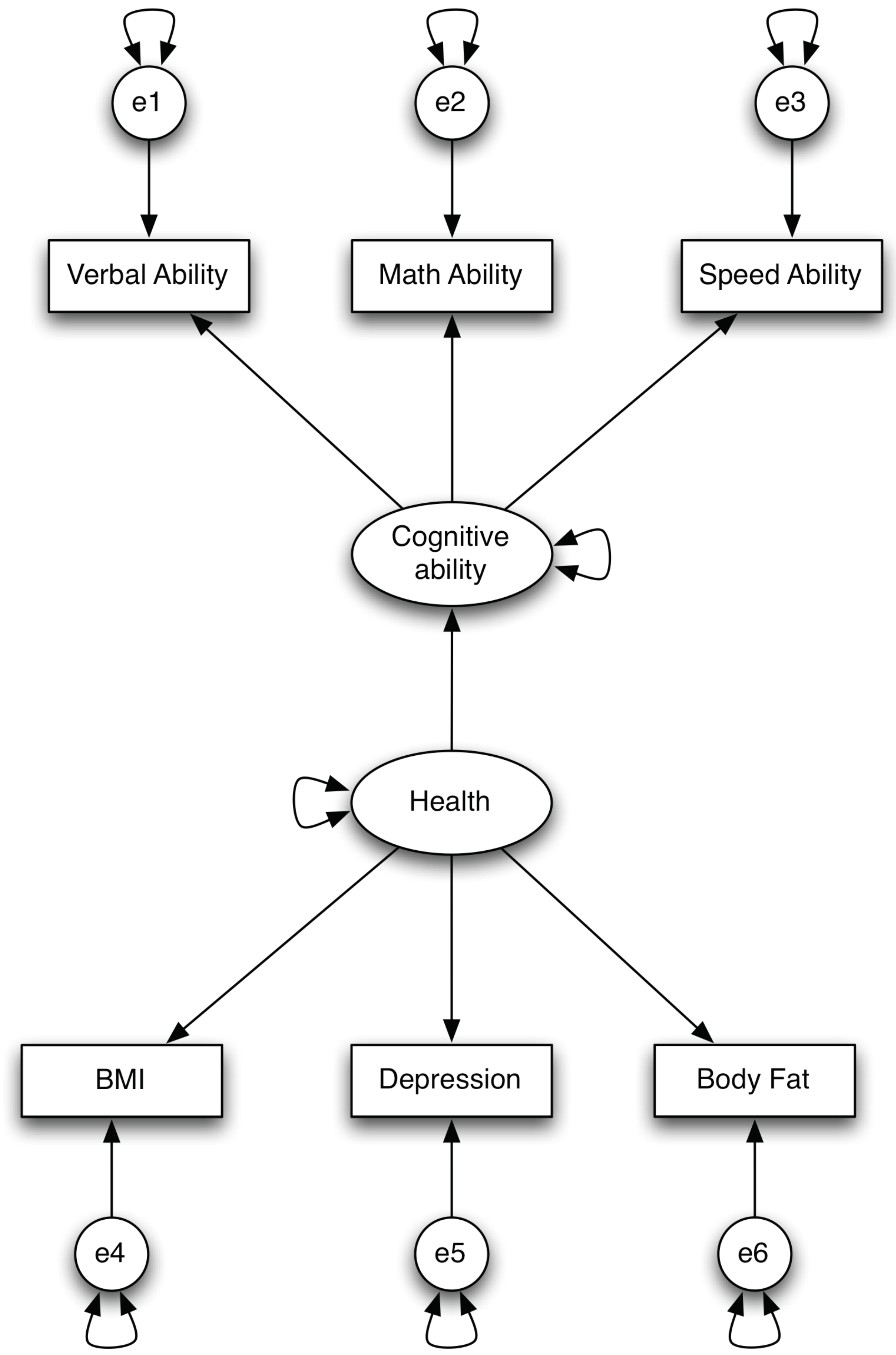 If one believes that health influences cognitive ability, then one can fit a path model using the factors – cognitive ability and health. Therefore, a structural model is actually a path model. Putting them together, we have a model in Figure 3. This model is called SEM model.